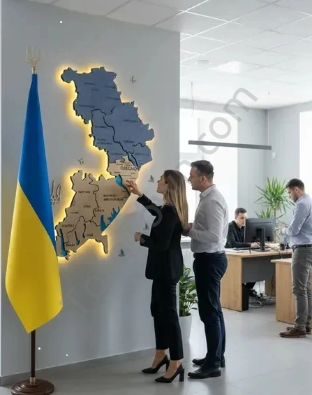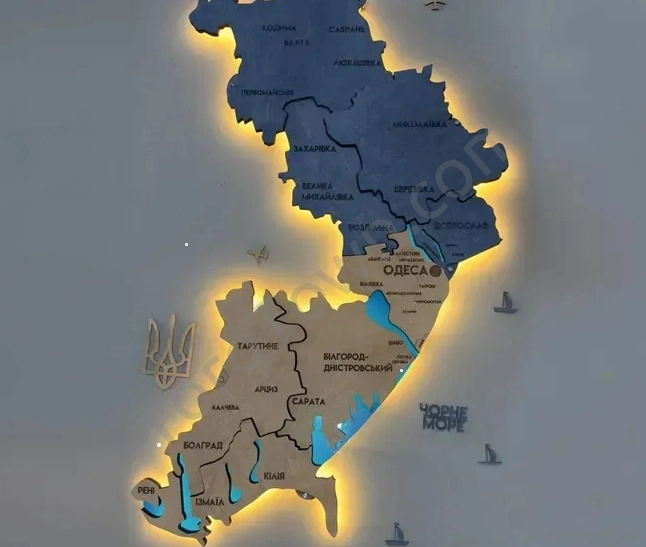 Особливості: - Наскрізне гравіювання назв областей, що дає змогу краще розрізняти назви на відстані; - Монтується до стіни на дистанційні кріплення на відстані 4 см, що додає ефектності підсвітці за рахунок тіней від стіни;