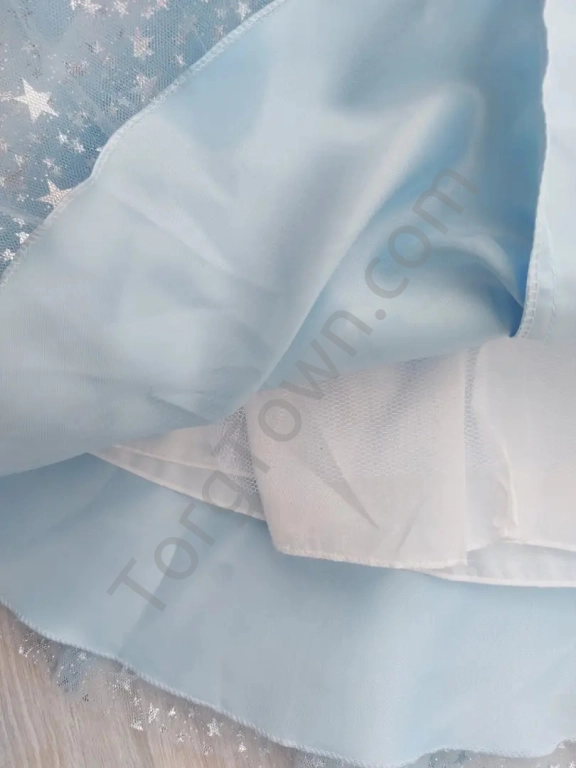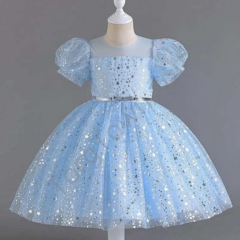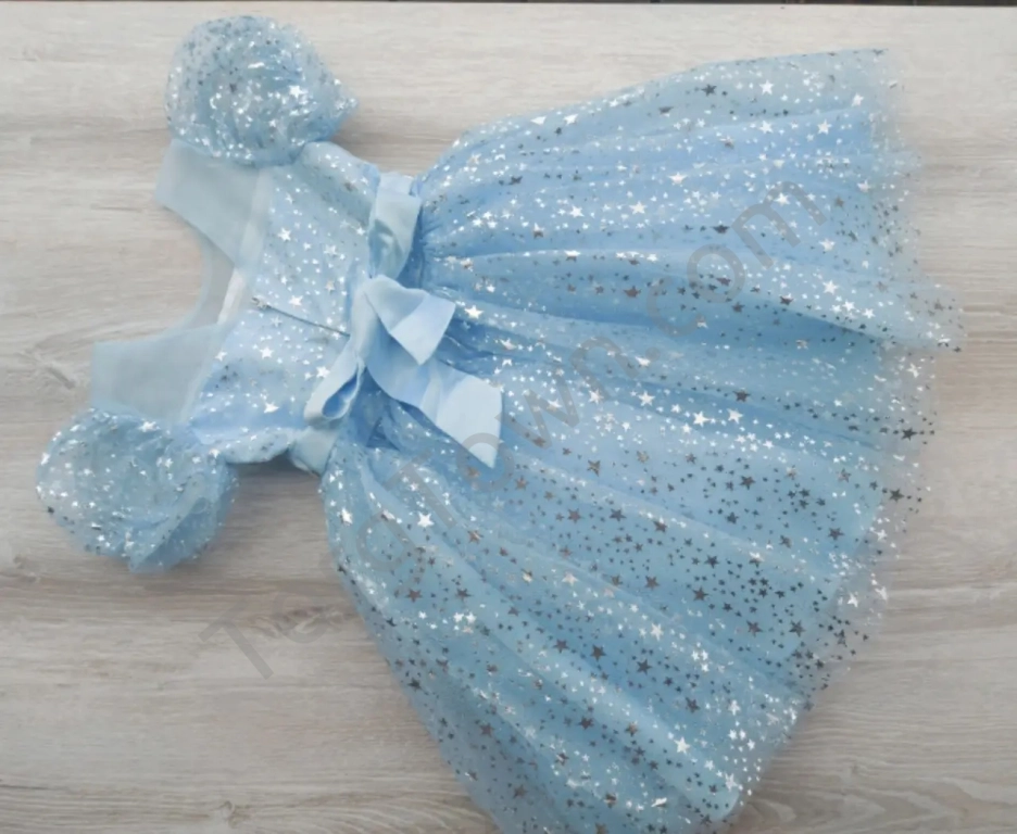 Святкове блискуче плаття на дівчинку. Топ сукні - атлас на бавовняному підкладі, розшитий стразами, спідниця - кілька шарів фатину в блискучі зірки і два щільні под'юбники. Застібка – блискавка на спинці. Бант кріпиться на шпильку.