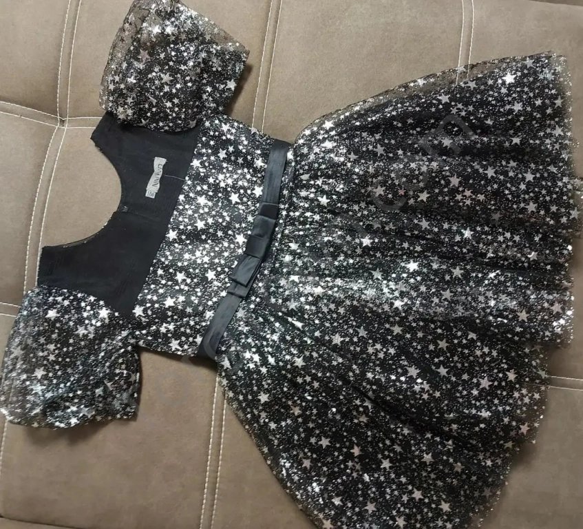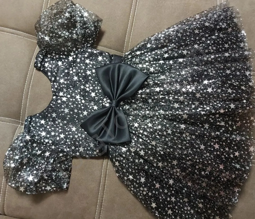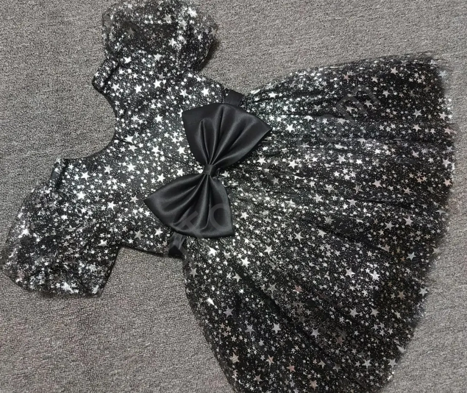 Святкове блискуче плаття на дівчинку. Топ сукні - атлас на бавовняному підкладі, розшитий стразами, спідниця - кілька шарів фатину в блискучі зірки і два щільні под'юбники. Застібка – блискавка на спинці. Бант кріпиться на шпильку.